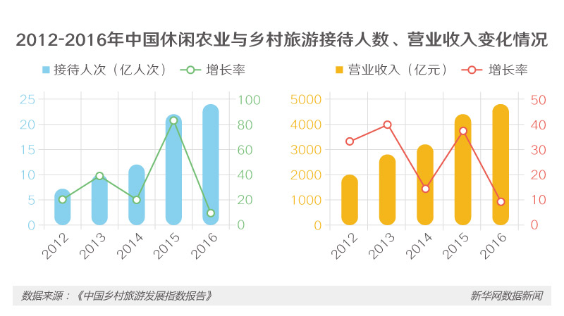 據(jù)統(tǒng)計(jì),過去五年,中國(guó)鄉(xiāng)村旅游游客接待人次和營(yíng)業(yè)收入年均增速分別達(dá)32.0%和26.2%。2016年,鄉(xiāng)村旅游游客接待已達(dá)24億人次,占國(guó)內(nèi)游客接待人次的54.4%;營(yíng)業(yè)總收入達(dá)4800億元,占國(guó)內(nèi)旅游總收入的12.2%。預(yù)計(jì)到2020年,全國(guó)鄉(xiāng)村旅游年接待游客將超40億人次,實(shí)現(xiàn)總收入2.3萬億元。