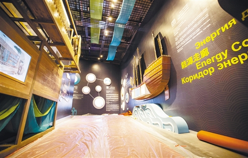 這是6月7日在哈薩克斯坦阿斯塔納專項世博會中國館內(nèi)拍攝的“能源走廊”展區(qū)。 本屆世博會中國館圍繞“未來能源 綠色絲路”主題,通過實物模型、電子和機械沙盤、多媒體裝置、虛擬現(xiàn)實技術(shù)、3D弧幕電影等方式,全面介紹了中國在能源開發(fā)與利用進程中的代表性成果。 (新華社發(fā))
