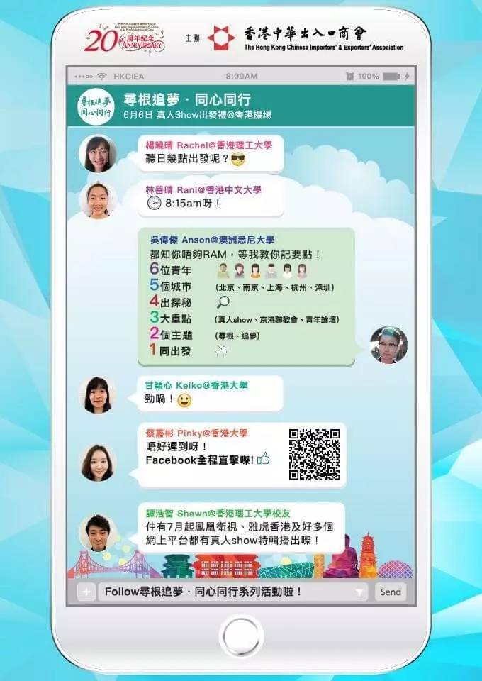 “尋根追夢(mèng) 同心同行”活動(dòng)挑選了6位來(lái)自各大院校及界別的年輕人一同到內(nèi)地進(jìn)行交流。參與活動(dòng)的6位青年分別是來(lái)自香港大學(xué)的甘穎心(Keiko)、蔡嘉彬(Pinky),香港理工大學(xué)的楊曉晴(Rachel)及校友譚浩智(Shawn),香港中文大學(xué)的林善晴 (Rani),以及澳洲悉尼大學(xué)的吳偉杰 (Anson)。