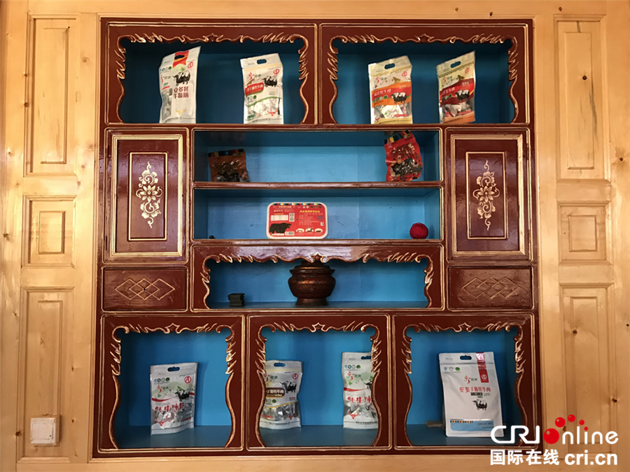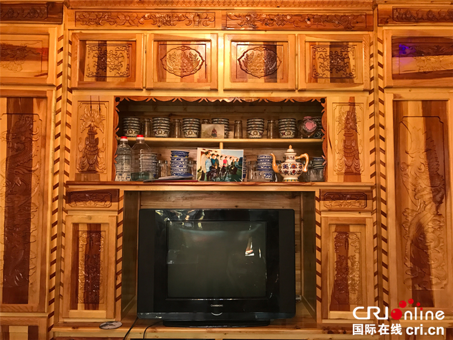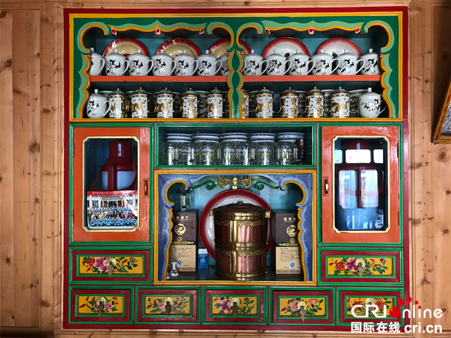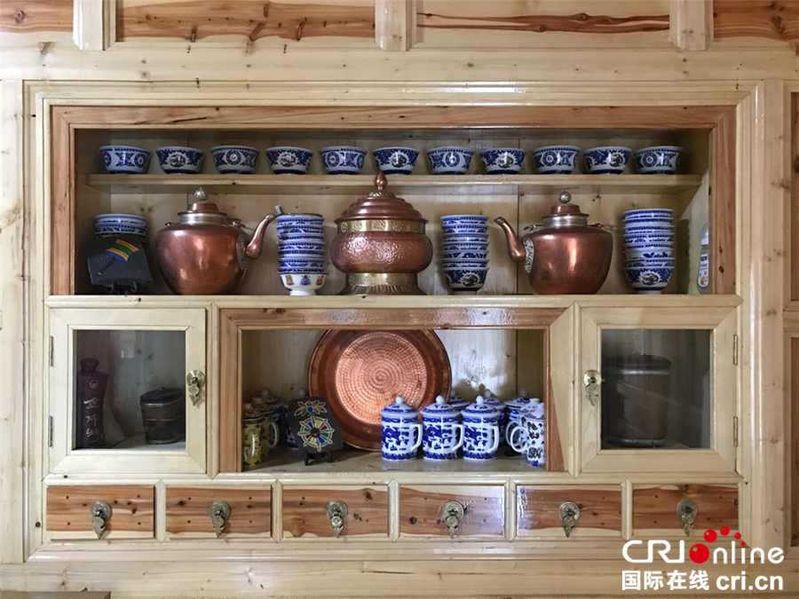 國(guó)際在線消息(記者 劉華楨 朱梅):在甘南藏區(qū),幾乎每戶藏民家的客廳里都會(huì)有這樣一個(gè)開(kāi)放式的壁櫥,上面整整齊齊地?cái)[放著瓷制的碗碟、茶壺、蓋碗,銅制的水壺、暖鍋、面盆,也許有點(diǎn)零食,也許還有幾瓶珍藏的好酒,有的人家讓它兼了電視柜的功能,有的人家還會(huì)放上一張全家福,溫馨滿滿。