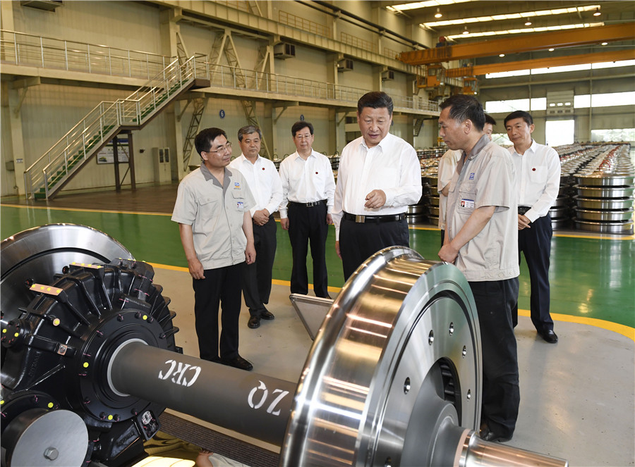 6月22日,習近平總書記在太原考察了兩家企業(yè)。太原重工軌道交通設備有限公司車輪車間機聲隆隆,熱軋生產線上鋼坯燒得通紅?倳浹刂呖兆呃炔炜锤哞F車輪生產流程,了解企業(yè)提升軌道交通裝備研發(fā)、設計、制造能力的情況。習近平還考察了盾構機生產裝備情況,觀看了山西省自主創(chuàng)新成果展示。在山西鋼科碳材料有限公司,總書記同職工親切交流,勉勵他們發(fā)揚工匠精神,為“中國制造”作出更大貢獻。