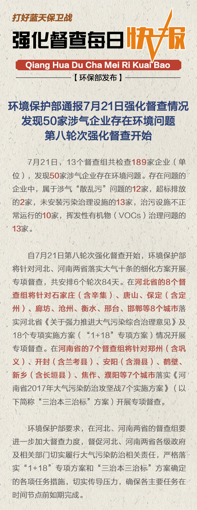 中新網(wǎng)7月23日電 據(jù)環(huán)境保護(hù)部宣傳教育司官方微博消息,環(huán)保部針對(duì)京津冀及周邊地區(qū)的強(qiáng)化環(huán)保督查,7月21日,13個(gè)督查組共檢查189家企業(yè)(單位),發(fā)現(xiàn)50家涉氣企業(yè)存在環(huán)境問題。