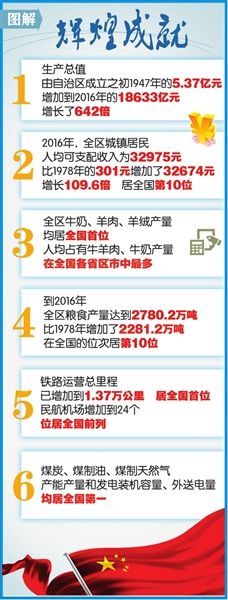 乘著扶持政策的“東風(fēng)”,衛(wèi)生事業(yè)發(fā)展成就矚目,人均預(yù)期壽命已升至75.8歲;教育事業(yè)快速發(fā)展,形成了覆蓋城鄉(xiāng)、層次齊全的現(xiàn)代化辦學(xué)體系;經(jīng)濟(jì)規(guī)模實(shí)現(xiàn)了“蝶變新生”,生產(chǎn)總值由自治區(qū)成立之初1947年的5.37億元增加到2016年的18633億元,增長了642倍。