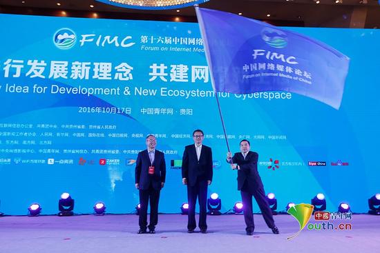 第十七屆中國(guó)網(wǎng)絡(luò)媒體論壇承辦方、中國(guó)經(jīng)濟(jì)網(wǎng)總裁王旭東(右)揮舞著從國(guó)家互聯(lián)網(wǎng)信息辦公室網(wǎng)絡(luò)新聞信息傳播局局長(zhǎng)姜軍(中)手中接過的旗幟。 中國(guó)青年網(wǎng)記者 張炎良 攝