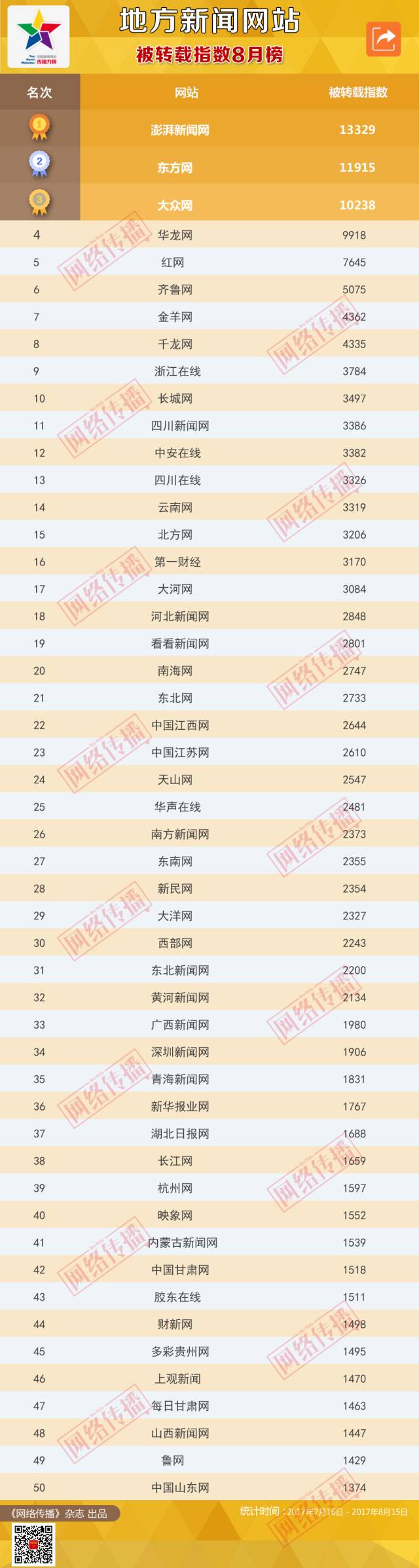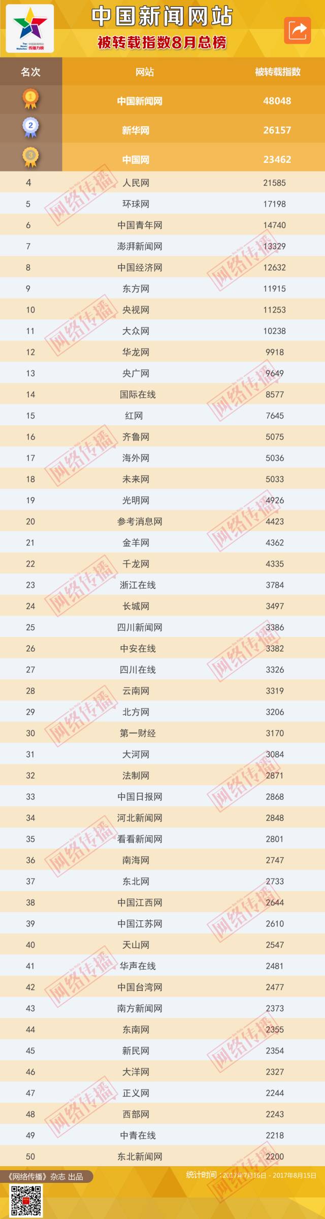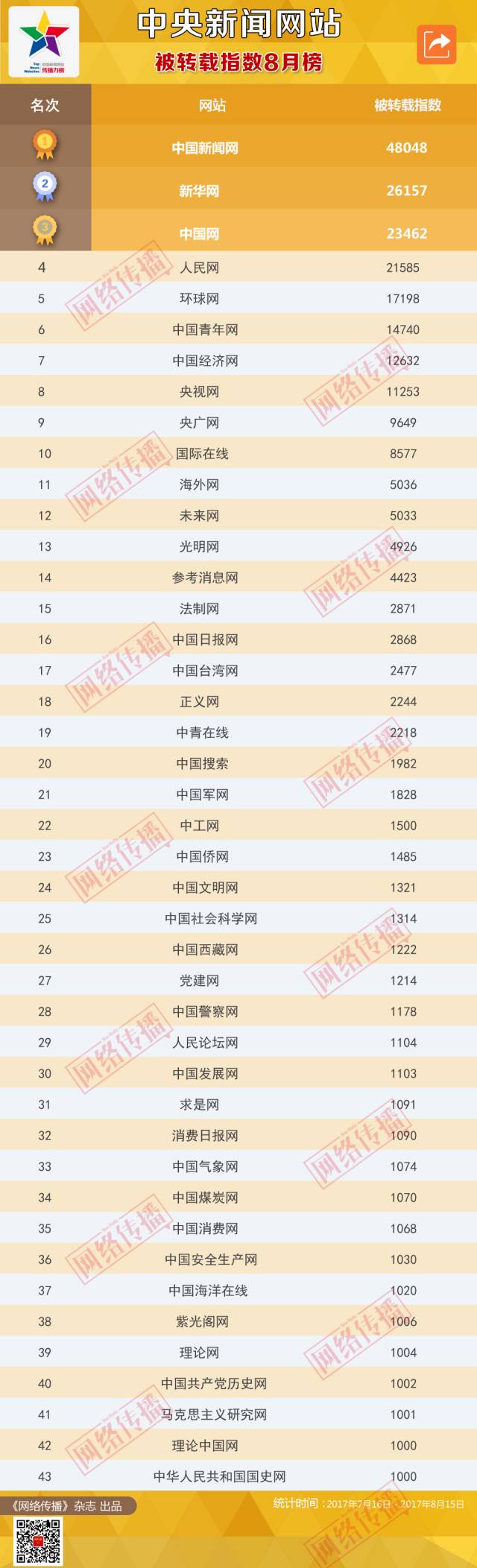 中國新聞網(wǎng)站被轉(zhuǎn)載指數(shù)2017年8月榜