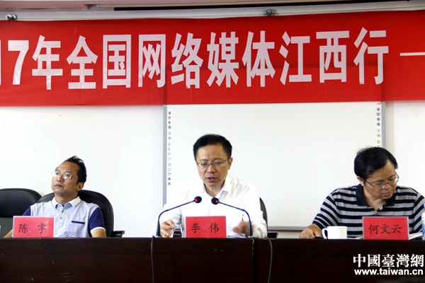 在媒體見面會上,南昌市新建區(qū)區(qū)委書記李偉(中)向記者們介紹了新建區(qū)概況。(中國臺灣網(wǎng) 李杰 攝)
