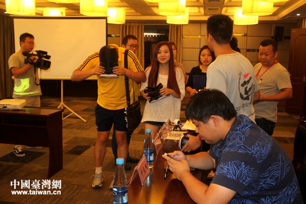 媒體發(fā)布會上,中國江西網利用航拍和全景VR鏡頭定格別樣的仙女湖,全國網媒記者紛紛戴上全景VR鏡頭先睹為快。(中國臺灣網 李杰 攝)