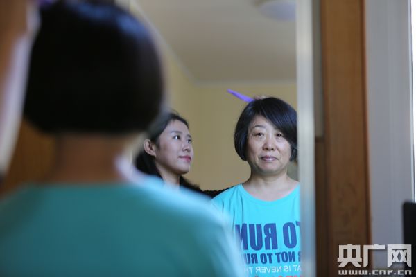 鄭忠燕的一個(gè)女兒正在為她整理頭發(fā)。 唐磊攝