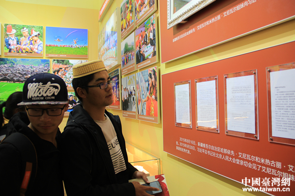 回族少年郭寶福(右)與同學在少數(shù)民族事業(yè)發(fā)展片區(qū)參觀。(中國臺灣網(wǎng) 李寧 攝)