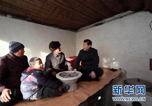 2012年12月29日至30日,習(xí)近平在河北省阜平縣看望慰問困難群眾。這是習(xí)近平在龍泉關(guān)鎮(zhèn)駱駝灣村看望唐榮斌老人一家。(圖片來源:新華社)