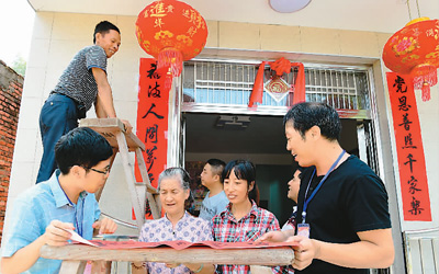 圖為9月21日,在福建省寧德市古田縣鳳埔鄉(xiāng)造福工程集中安置點,鄉(xiāng)干部黃東華(左一)和喜遷新居的林光鍋一家共同貼上喜慶的門聯(lián)。