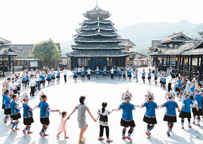 近年來,廣西三江侗族自治縣大力推進旅游扶貧工程,將侗族濃郁獨特的歌舞文化等民俗風情轉(zhuǎn)化為招攬游客的“法寶”。圖為在三江侗族自治縣林溪鎮(zhèn)冠洞村冠小屯,人們在歡跳多耶舞。