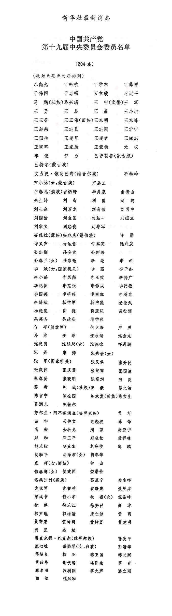 中國共產(chǎn)黨第十九屆中央委員會委員名單