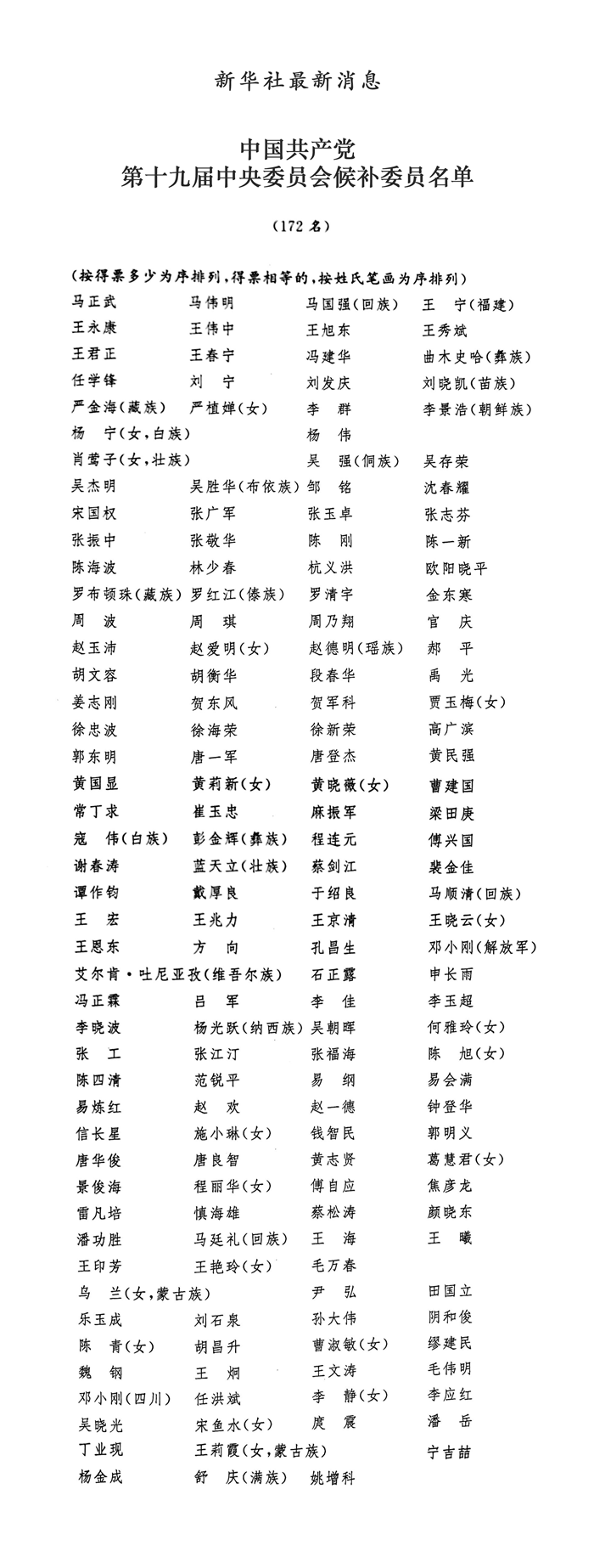 中國共產(chǎn)黨第十九屆中央委員會候補委員名單