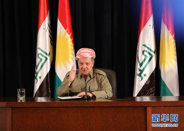 資料圖:9月24日,在伊拉克埃爾比勒,伊拉克庫爾德自治區(qū)(庫區(qū))主席馬蘇德·巴爾扎尼出席記者會(huì)。新華網(wǎng)發(fā)(哈利勒·達(dá)伍德攝)