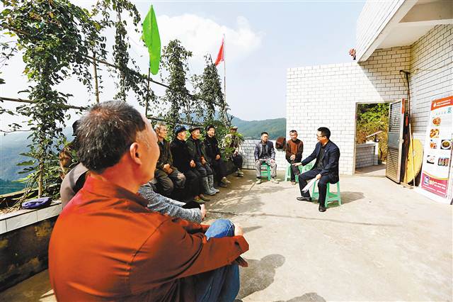 楊大可(右一)結合身邊實際,向村民宣講十九大精神。 (云陽報社供圖)