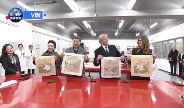 國家主席習(xí)近平和夫人彭麗媛8日下午與來華進行國事訪問的美國總統(tǒng)特朗普和夫人梅拉尼婭共同參觀故宮文物醫(yī)院。
