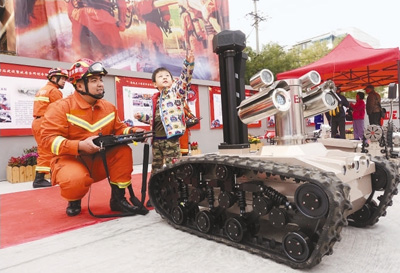 11月9日,北京市“119”消防宣傳月活動在西城區(qū)白紙坊小型消防站正式啟動;顒蝇F(xiàn)場,消防官兵在指導(dǎo)小朋友操縱消防偵察機器人。本報記者 王昊男 攝