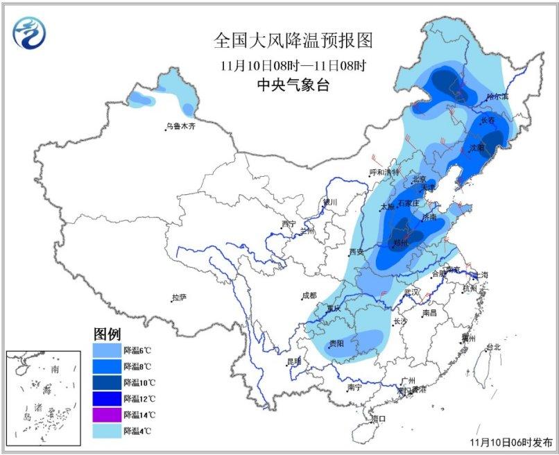 預(yù)計(jì),10日08時(shí)至11日08時(shí),內(nèi)蒙古東部、華北、東北地區(qū)大部、黃淮、江漢、江淮北部、江南西部、陜西東部、貴州東部等地最低氣溫或平均氣溫將下降4~6℃,其中,內(nèi)蒙古東北部、東北地區(qū)中南部、華北中南部、黃淮北部等地的部分地區(qū)降溫幅度可達(dá)8~10℃,上述地區(qū)將伴有4~6級(jí)風(fēng),陣風(fēng)可達(dá)7級(jí)。11日凌晨,最低氣溫0℃線將位于甘肅南部、陜西關(guān)中平原北部、河北南部至遼東半島南部一帶。中央氣象臺(tái)11月10日06時(shí)繼續(xù)發(fā)布寒潮藍(lán)色預(yù)警。