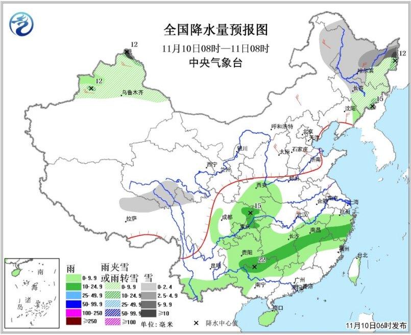 10日08時(shí)至11日08時(shí),黑龍江東北部有明顯降雪。東北地區(qū)中北部、新疆北部、青海南部等地有小到中雪或雨夾雪,其中,黑龍江東北部、新疆阿勒泰北部山區(qū)的部分地區(qū)有大雪,局地暴雪;浙江南部、江西中北部、湖南中部、貴州南部、廣西北部、四川盆地東北部、重慶中北部等地的部分地區(qū)有中雨。內(nèi)蒙古中東部、華北、東北、黃淮、江淮等地有4~6級(jí)偏北風(fēng),陣風(fēng)可達(dá)7級(jí)。