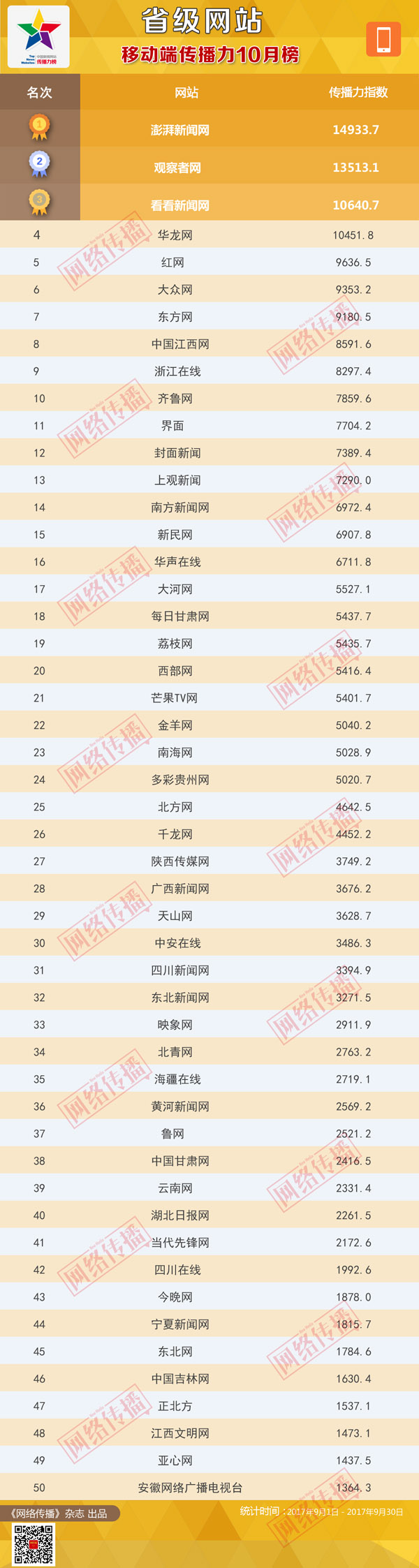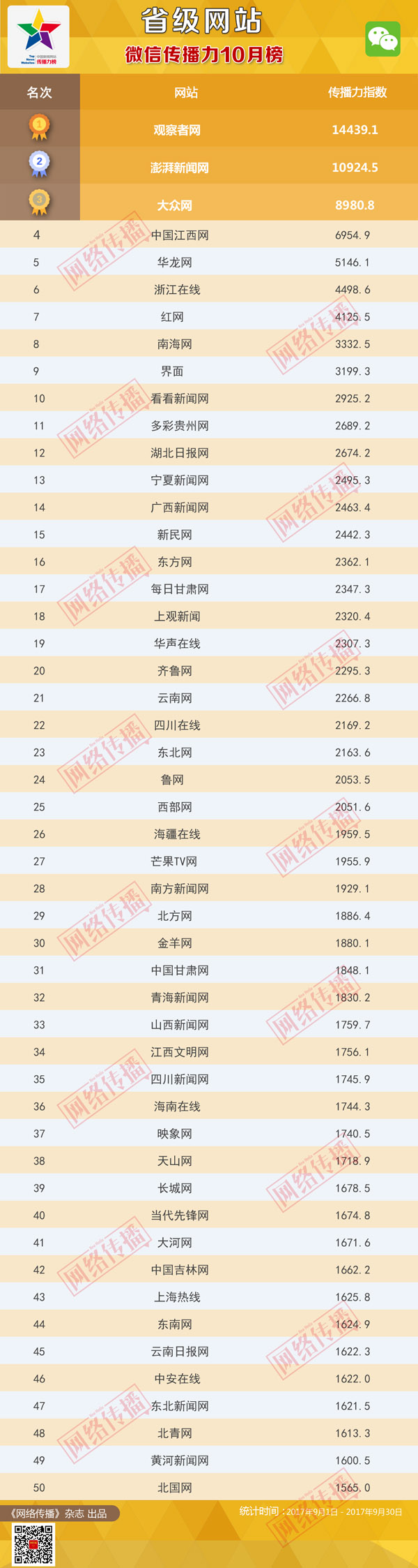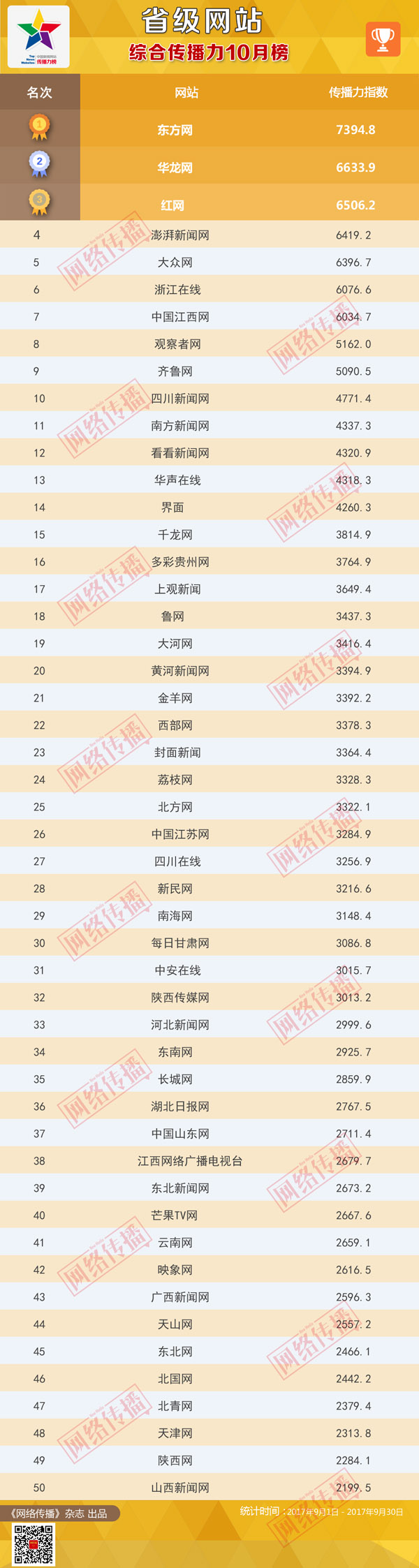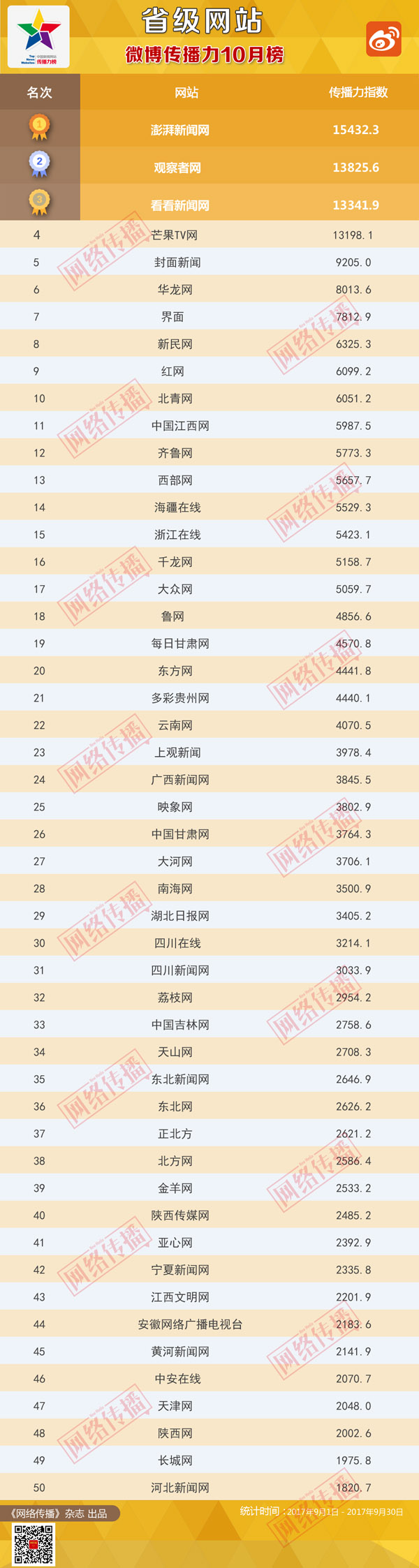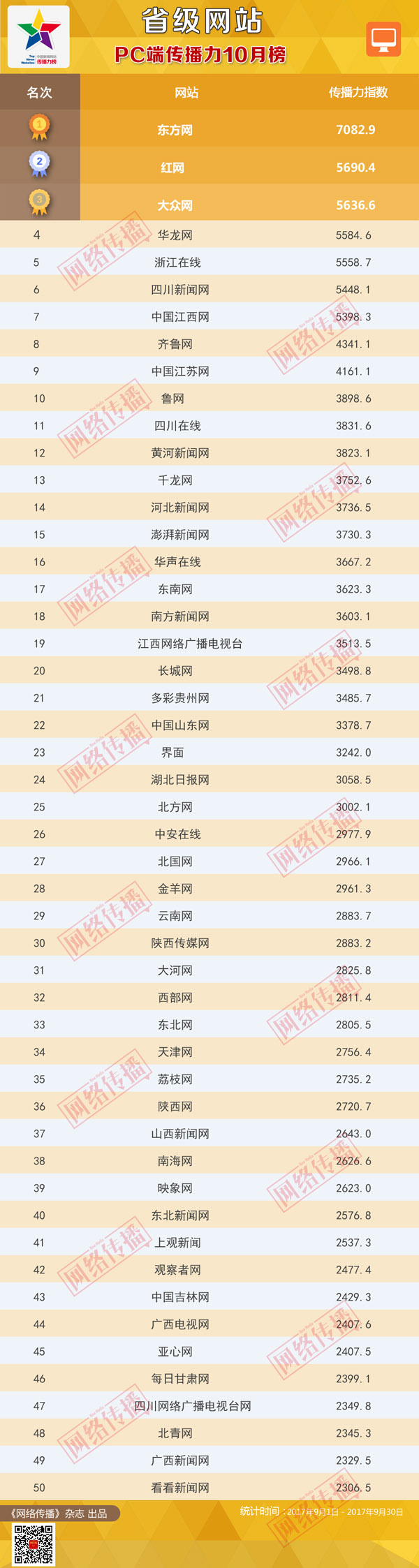 中央網(wǎng)信辦《網(wǎng)絡(luò)傳播》雜志傾力打造的“省級(jí)網(wǎng)站傳播力2017年10月榜”今日發(fā)布。