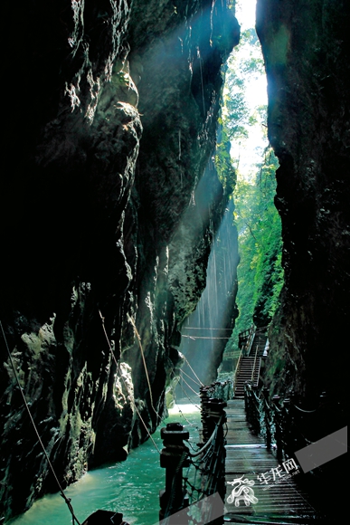 重慶市萬(wàn)盛經(jīng)開(kāi)區(qū)黑山谷景區(qū)所在山脈地處云貴高原向四川盆地過(guò)渡的大婁山余脈,是重慶和貴州兩省市的一座界山。景區(qū)內(nèi)有座石橋,分隔了重慶市與貴州省。這座石橋也是景區(qū)內(nèi)一系列浮橋的起點(diǎn)。游客走上浮橋,便同時(shí)置身于重慶與貴州兩省市之間。