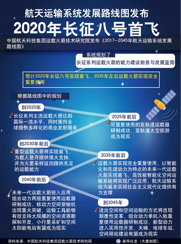 航天運輸系統(tǒng)發(fā)展路線圖發(fā)布:2020年長征八號首飛 新華社發(fā) 大巢制圖