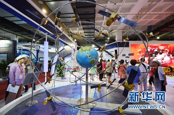 2017年6月9日,參觀者在第二十屆中國北京國際科技產(chǎn)業(yè)博覽會上參觀展出的北斗衛(wèi)星導(dǎo)航系統(tǒng)模型。新華社記者 鞠煥宗 攝