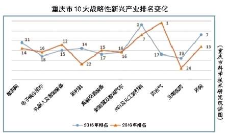 與2015年相比,重慶市10大戰(zhàn)略性新興產(chǎn)業(yè)科技競爭力在全國的排名呈上升趨勢:電子核心部件、機(jī)器人及智能裝備、高端交通裝備、頁巖氣均排名上升;物聯(lián)網(wǎng)、新材料、MDI及化工新材料、生物醫(yī)藥、環(huán)保排名稍有下降;新能源及智能汽車排名不變。