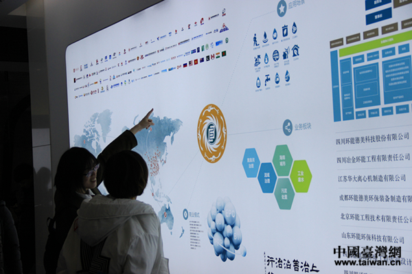 記者們在環(huán)能德美環(huán)保裝備有限公司的展示欄邊駐足討論。(中國臺灣網(wǎng) 李寧 攝)