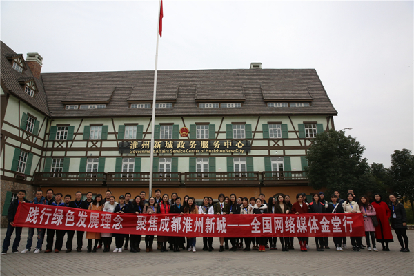 “踐行綠色發(fā)展理念 聚焦成都淮州新城”——全國網(wǎng)絡(luò)媒體金堂行記者在淮州新城政務(wù)服務(wù)中心合影
