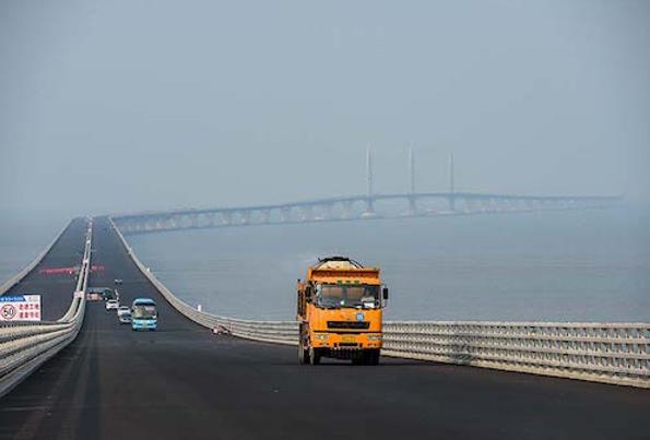 一輛運(yùn)輸瀝青的工程車輛行駛在港珠澳大橋橋面上。(圖片來(lái)源:新華社)