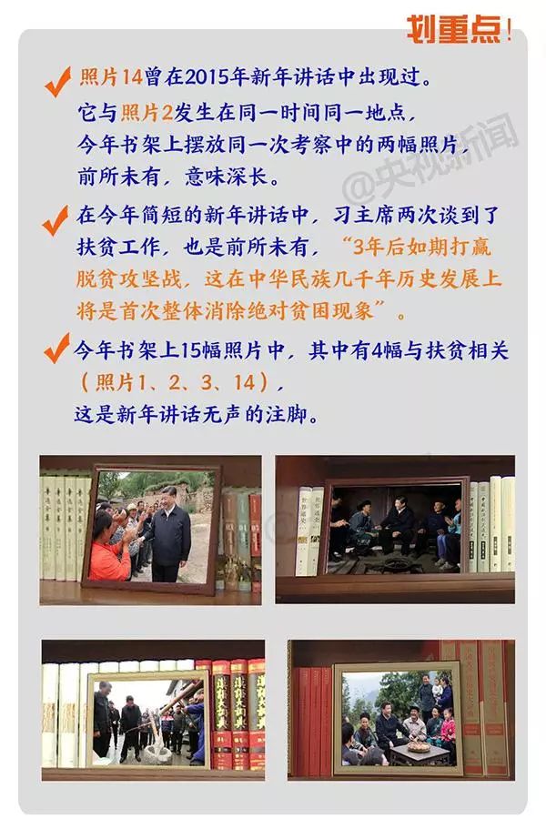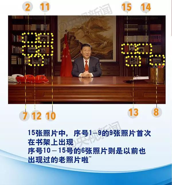 從2014年新年開(kāi)始,“習(xí)近平新年賀詞”成為了每年新舊交替之際的新聞熱點(diǎn)和網(wǎng)絡(luò)熱議。“擼起袖子加油干”、“我要為偉大的人民點(diǎn)贊”等等金句,因?yàn)槌霈F(xiàn)在習(xí)近平往年的“新年賀詞”中,而成為了中國(guó)社會(huì)的“流行語(yǔ)”。同樣,習(xí)近平辦公室書(shū)架上,那一幅幅照片,也成為人們十分關(guān)注的“新年賀詞”的“背景”。