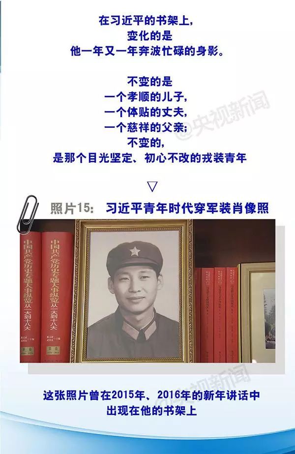 2017年1月,習(xí)近平在春節(jié)團(tuán)拜會(huì)上講了這樣一番話:“不能忘了人間真情,不要在遙遠(yuǎn)的距離中隔斷了真情,不要在日常的忙碌中遺忘了真情,不要在日夜的拼搏中忽略了真情”。以下4幅照片,從2014年開(kāi)始,就一直出現(xiàn)在習(xí)主席的書(shū)架上,也是他的真情流露——