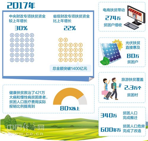 國務(wù)院扶貧辦數(shù)據(jù)顯示,2017年,中央財政專項扶貧資金較上年增長30%,省級財政專項扶貧資金比上年增長22%,總金額突破1400億元。電商扶貧帶動274萬貧困戶增收,光伏扶貧直接惠及80萬貧困戶,旅游扶貧覆蓋2.3萬個貧困村。340萬貧困人口完成搬遷,600多萬貧困人口危房完成了改造。健康扶貧救治了421萬大病和慢性病貧困患者,貧困人口醫(yī)療費用實際報銷比例提高到80%以上。