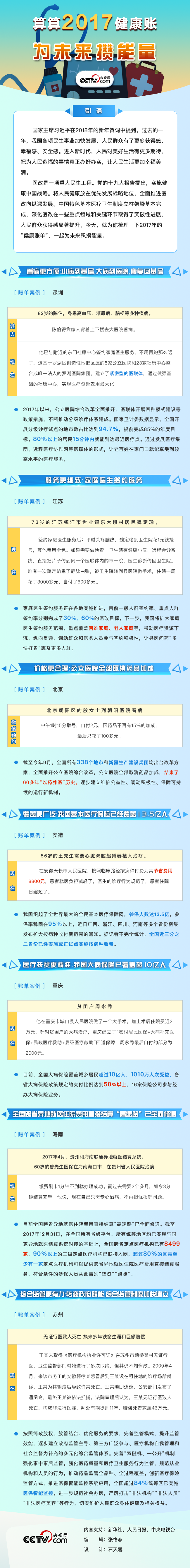 醫(yī)改是一項(xiàng)重大民生工程。黨的十九大報(bào)告提出,實(shí)施健康中國戰(zhàn)略。將人民健康放在優(yōu)先發(fā)展戰(zhàn)略地位,全面推進(jìn)醫(yī)改向縱深發(fā)展。中國特色基本醫(yī)療衛(wèi)生制度立柱架梁基本完成,深化醫(yī)改在一些重點(diǎn)領(lǐng)域和關(guān)鍵環(huán)節(jié)取得了突破性進(jìn)展,人民群眾獲得感顯著提升。今天,就為你梳理一下2017年的“健康賬單”,一起為未來積攢能量。