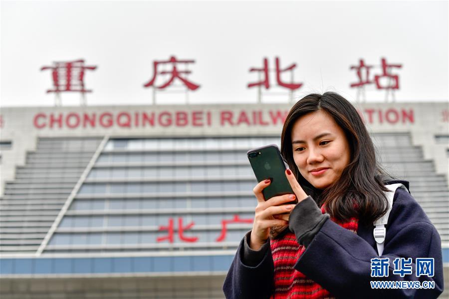 2月9日,在重慶火車北站北廣場上,張羽靚用手機查閱自己的訂票信息。隨著智能移動通訊設備的普及,許多出行的旅客使用智能手機購票、訂餐、支付等,一些旅客還用手機記錄自己的行程。今年25歲的重慶女孩張羽靚是一名攝影愛好者,2月9日,她從重慶北到大足南,用手機記錄了一次“指尖上的智能春運”。新華社記者 劉潺攝