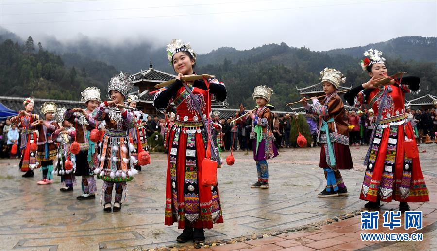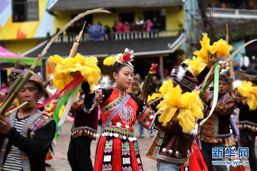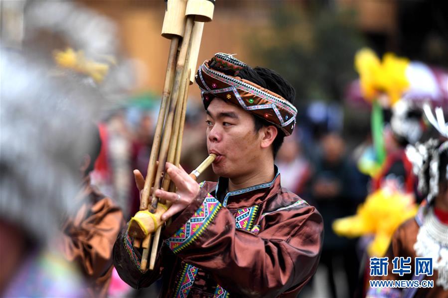 2月24日,融安縣長(zhǎng)安鎮(zhèn)安寧村大袍屯苗族群眾在表演蘆笙踩堂。新華社記者 張愛(ài)林?jǐn)z