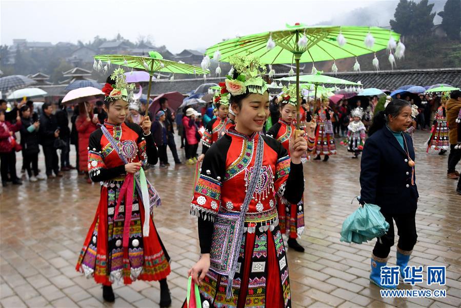 2月24日,融安縣長(zhǎng)安鎮(zhèn)安寧村大袍屯苗族群眾在向觀眾拋撒糖果。新華社記者 張愛(ài)林?jǐn)z