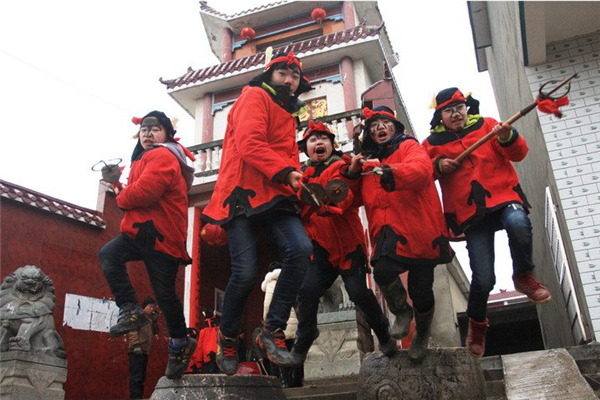 孩子們頭戴長巾,身穿“五猖服”,臉涂紅、白、黑三色,手握鋼叉,號稱“五猖兵馬”,象征正義之神。早飯后,開始第一次巡邏,大人們鳴鑼擊鼓,“五猖兵馬”在各家各戶之間往來呼喚,驅(qū)趕“狐貍夜貓”,好不熱鬧!