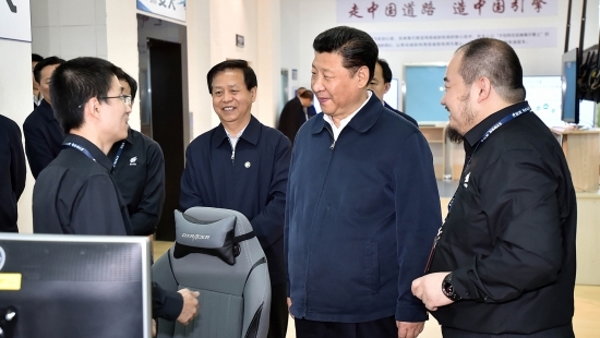 習近平總書記強調,要深入貫徹黨的十九大精神,增強使命感和責任感,真抓實干,緊抓快干,不斷開創(chuàng)新時代軍民融合深度發(fā)展新局面。圖為習總書記在視察調研中聽取民企科技人員介紹網絡安全技術研發(fā)情況。
