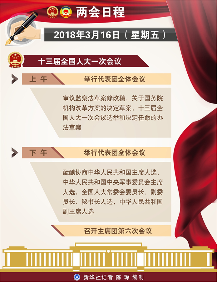 新華社北京3月15日電 十三屆全國人大一次會(huì)議16日全天舉行代表團(tuán)全體會(huì)議,上午審議監(jiān)察法草案修改稿,關(guān)于國務(wù)院機(jī)構(gòu)改革方案的決定草案,十三屆全國人大一次會(huì)議選舉和決定任命的辦法草案;下午醞釀協(xié)商中華人民共和國主席人選,中華人民共和國中央軍事委員會(huì)主席人選,全國人大常委會(huì)委員長、副委員長、秘書長人選,中華人民共和國副主席人選。下午,召開主席團(tuán)第六次會(huì)議。