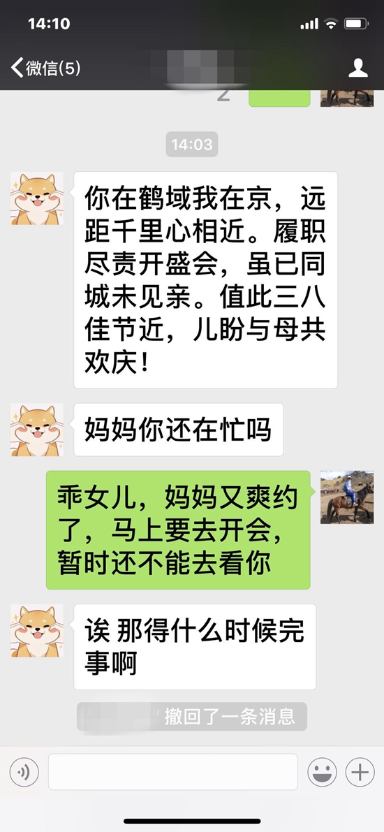 “你在鶴城我在京,遠(yuǎn)距千里心相近。履職盡責(zé)開(kāi)盛會(huì),雖已同城未見(jiàn)親。值此三八佳節(jié)近,兒盼與母共歡慶!”