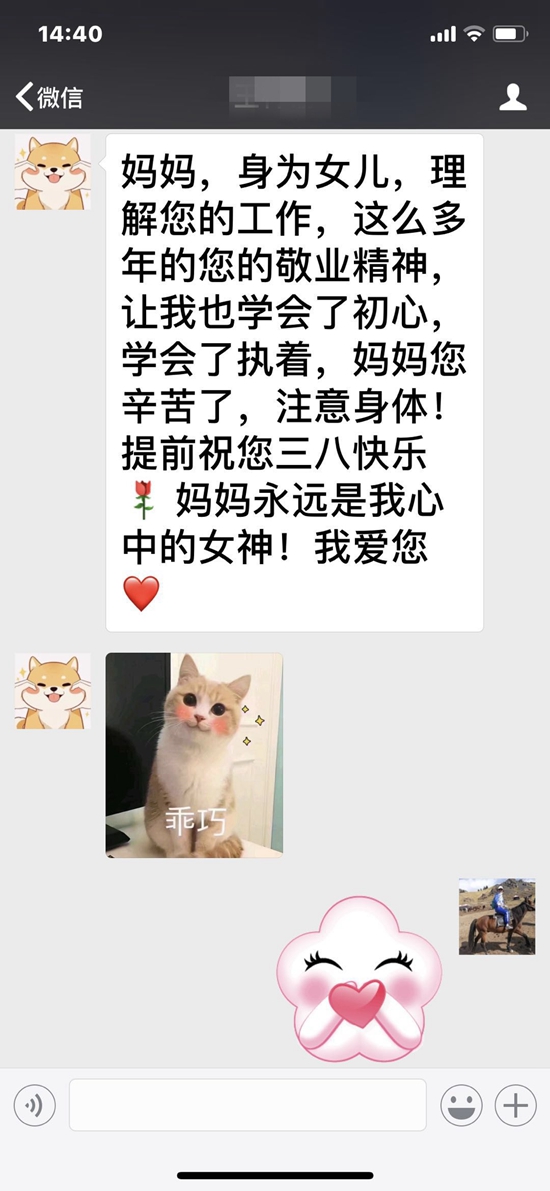 半個(gè)多小時(shí)后,女兒又給她發(fā)微信說(shuō):“媽媽,身為女兒,理解您的工作,這么多年的您的敬業(yè)精神,讓我也學(xué)會(huì)了初心,學(xué)會(huì)了執(zhí)著,媽媽您辛苦了,注意身體!提前祝您三八快樂(lè)(一枝玫瑰花)媽媽永遠(yuǎn)是我心中的女神!我愛(ài)您(一顆紅心)”。