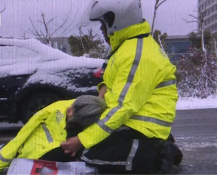 他跪在結(jié)冰的馬路上,帶給老人溫暖