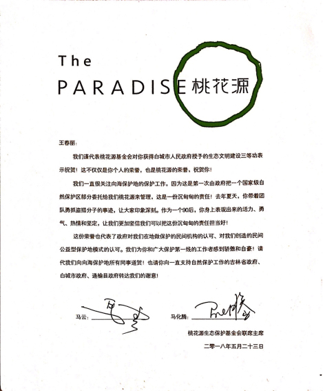 桃花源向海生態(tài)保護中心的28歲姑娘王春麗沒有想到,自己居然能夠得到馬云和馬化騰這兩位著名企業(yè)家聯(lián)合親筆簽名的賀信。日前,“二馬”以桃花源生態(tài)保護基金會聯(lián)席主席的身份,在信中祝賀她獲得白城市生態(tài)文明建設三等功,并感謝她和團隊為向海生態(tài)保護做出的貢獻。