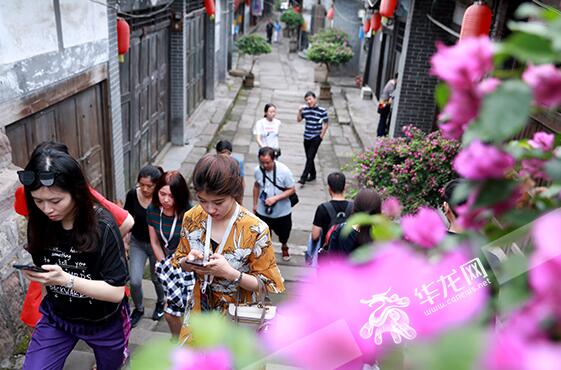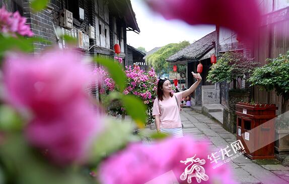 古色古香的巷道,開滿了紅色的花朵,引得游客不禁自拍留念。記者 謝鵬 攝