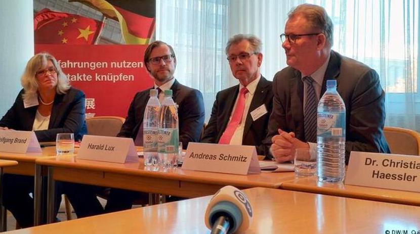 德中經(jīng)濟(jì)聯(lián)合會(huì)顧問(wèn)委員會(huì)主席施密茨(右一)正在新聞發(fā)布會(huì)上發(fā)言。圖片來(lái)源:德國(guó)之聲網(wǎng)站報(bào)道截圖