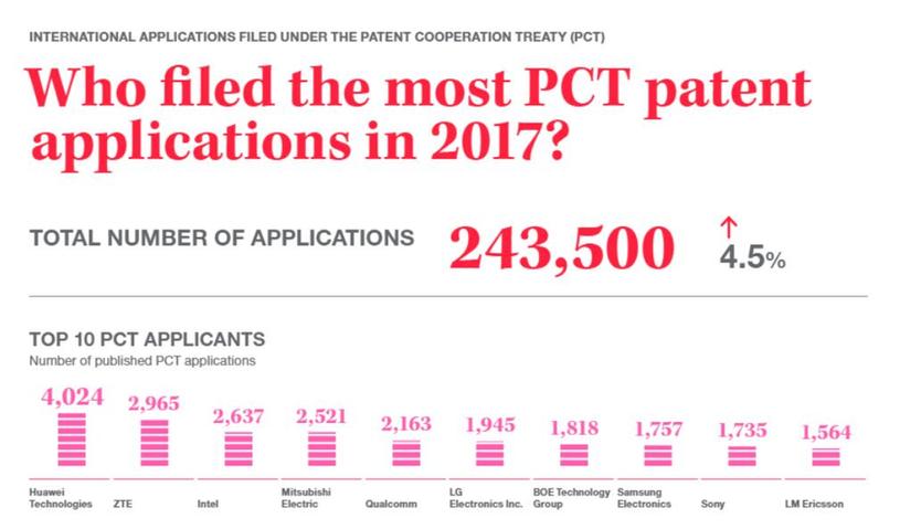 華為和中興兩家中國(guó)企業(yè)雄踞專利申請(qǐng)榜前兩位。圖片來(lái)源:世界知識(shí)產(chǎn)權(quán)組織(WIPO)官網(wǎng)截圖