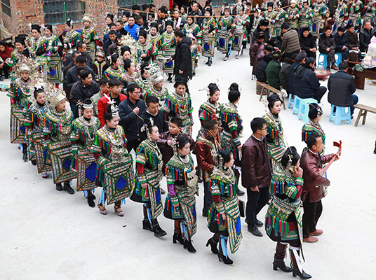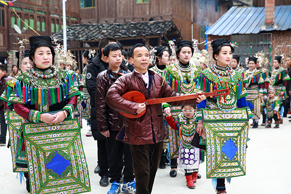 2月8日是大年初四,貴州省黔東南苗族侗族自治州榕江縣朗洞鎮(zhèn)高便村的侗族同胞身穿盛裝,彈唱琵琶歌踩歌堂,歡度新年。